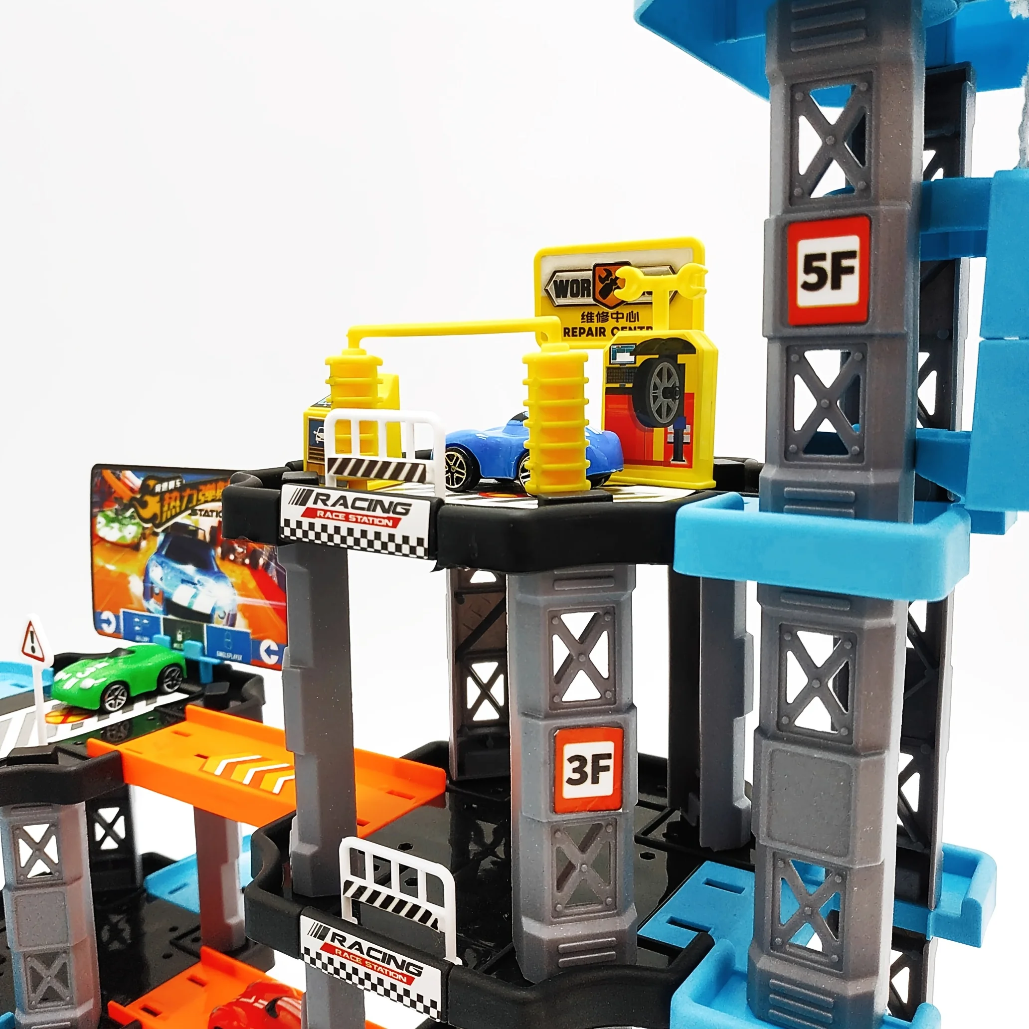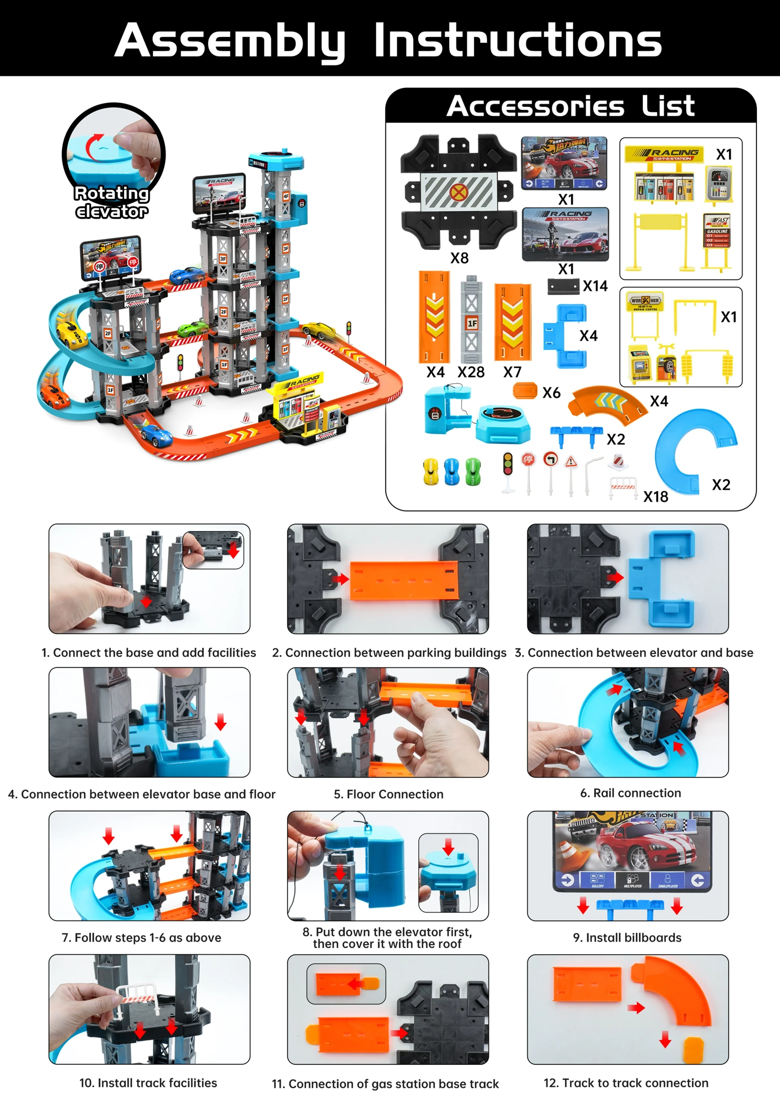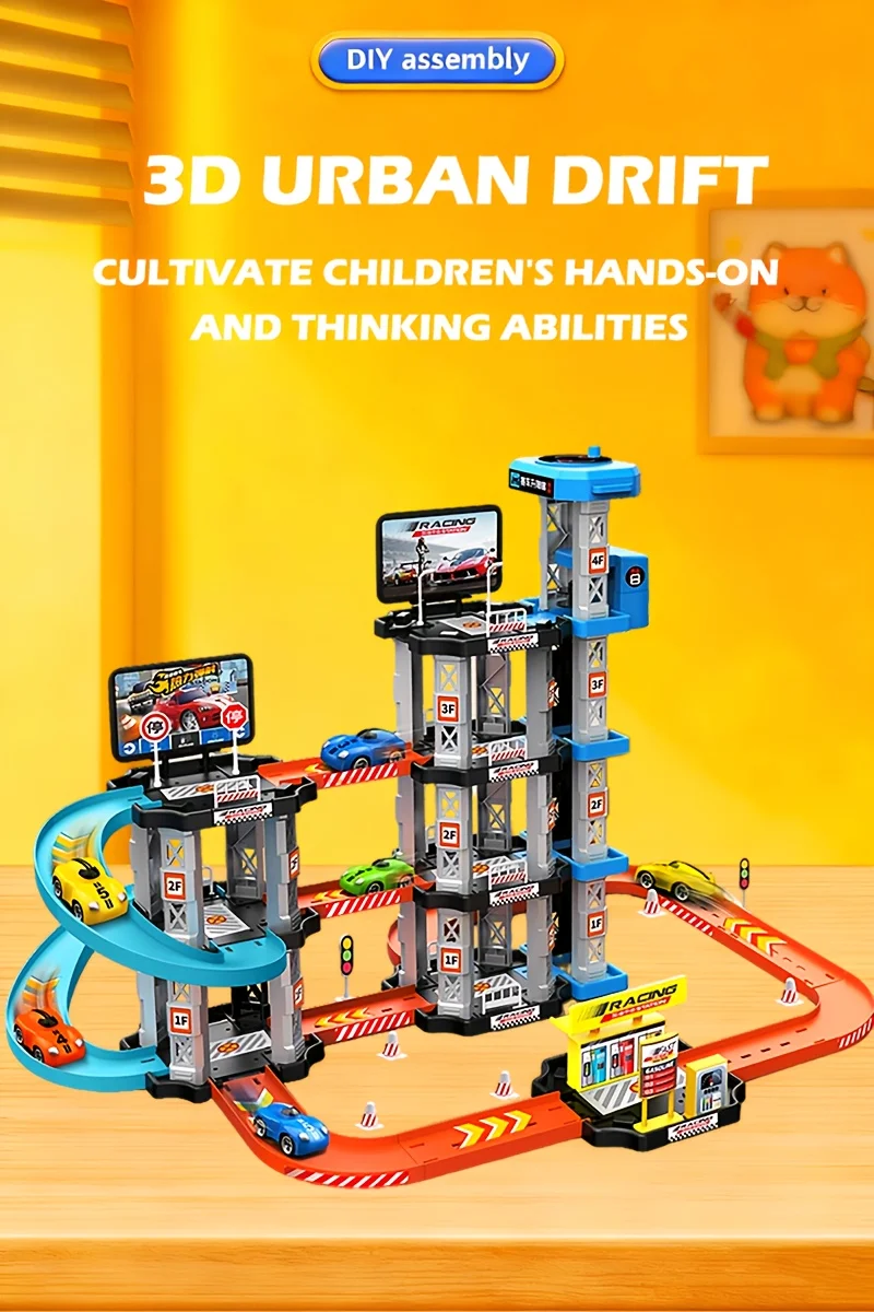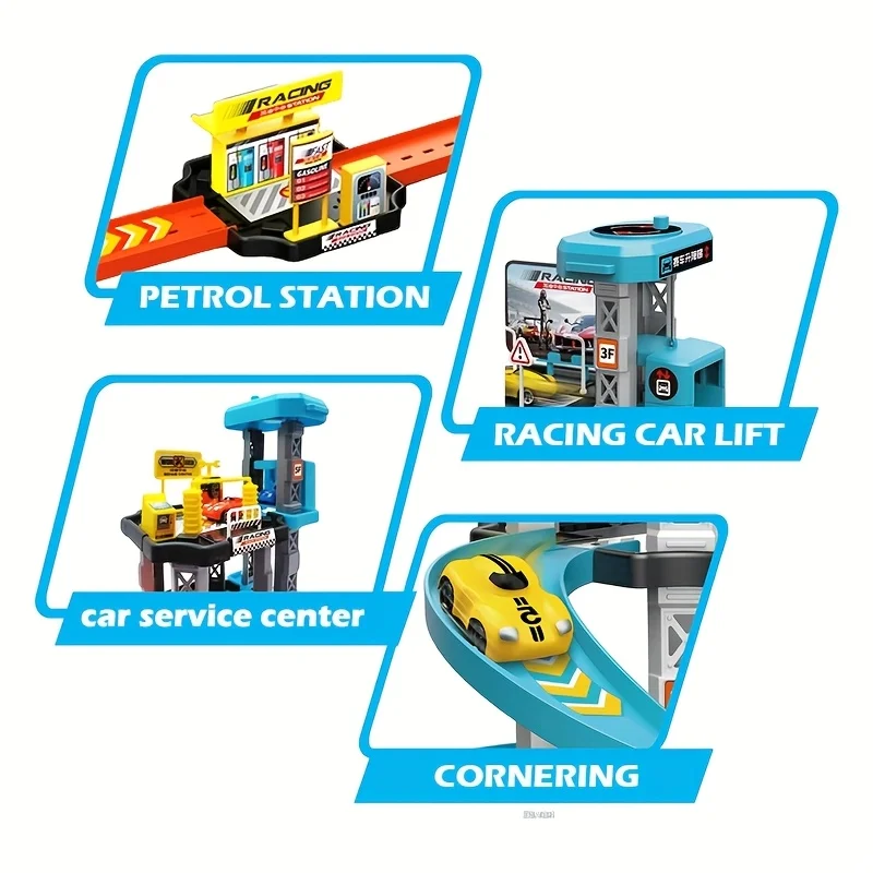 Garage Track Set with Elevator 4 Levels Toy Car Garage with Rails Race Car Ramp Track Toy Set with Mini Cars for Boys Girls Gift